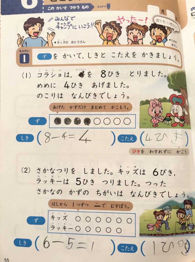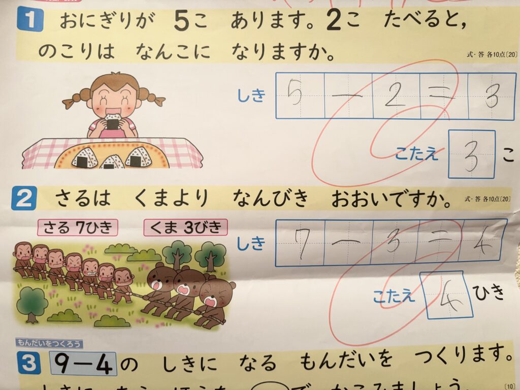 ひきざんの文章問題では、「のこり」を聞かれる問いと「ちがい」を聞かれる問いのどちらにも対応した問題がありました。